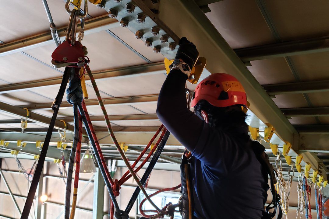 エイドクライミングの技術の研修の様子です。梁などに直接ぶら下がり水平移動するトレーニングです。